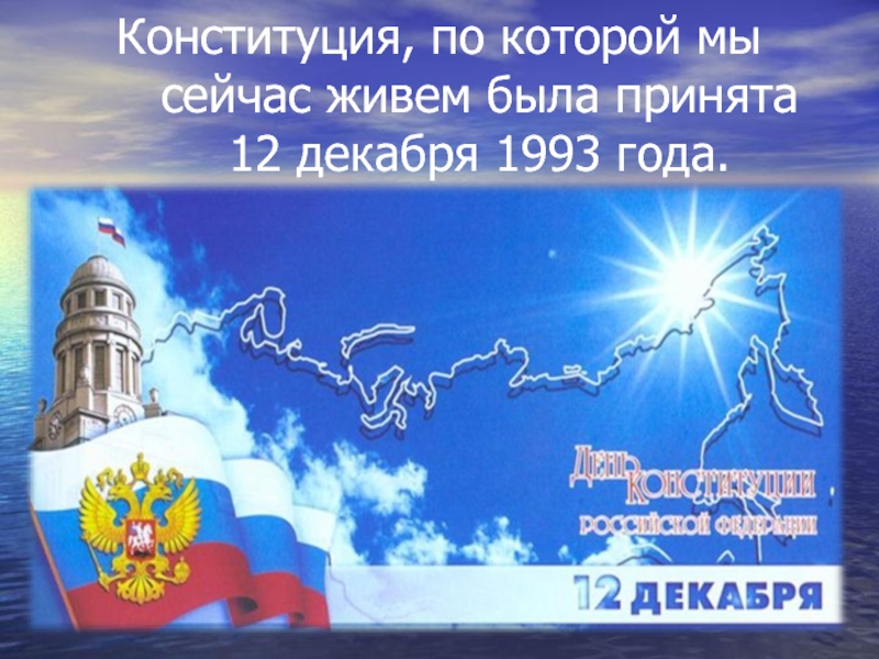 Слайд 7Конституция, по которой мы сейчас живем была принята 12 декабря 1993
