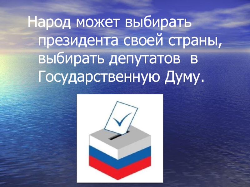 Слайд 15 Народ может выбирать президента своей страны, выбирать депутатов в Государственную Думу.