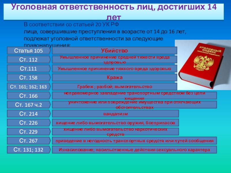 За ряд достаточно серьезных преступлений, общественная опасность которых осознается и в более раннем возрасте, уголовной ответственности подлежат лица, достигшие 14-летнего возраста.