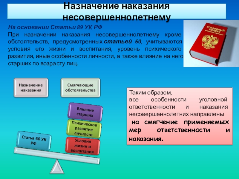 При назначении наказания несовершеннолетнему кроме обстоятельств, предусмотренных статьей 60, учитываются условия его жизни и воспитания, уровень психического развития, иные особенности личности, а также влияние на него старших по возрасту лиц.