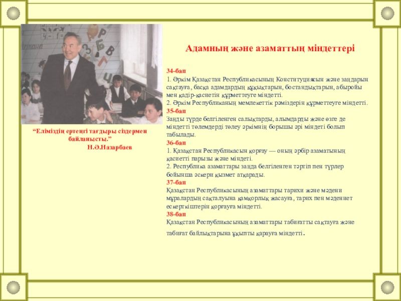1. Азаматтардың мемлекеттік оқу орындарында тегін орта білім алуына кепілдік беріледі. Орта білім алу міндетті.(30-бабы)