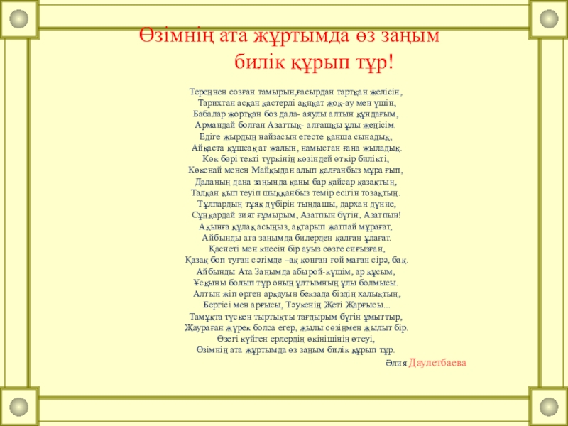 Алтын жіп өрген арқауын бекзада біздің халықтың,