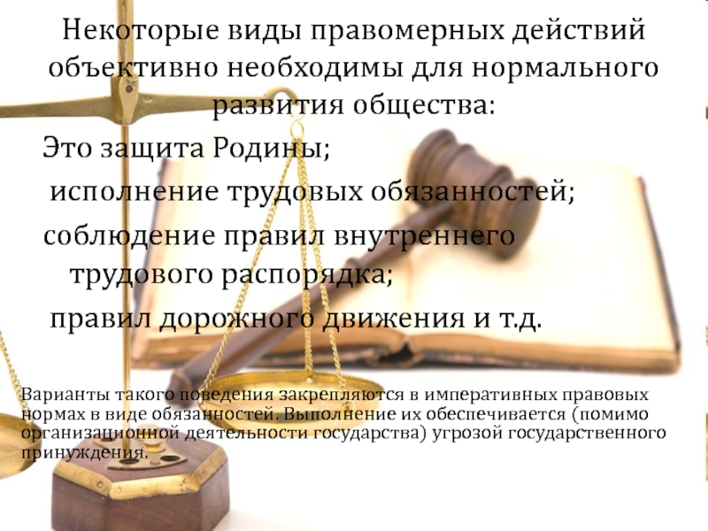 Варианты такого поведения закрепляются в императивных правовых нормах в виде обязанностей. Выполнение их обеспечивается (помимо организационной деятельности государства) угрозой государственного принуждения.