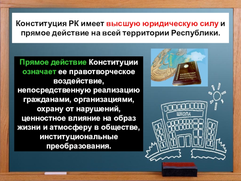 Слайд 5Конституция РК имеет высшую юридическую силу и прямое действие на всей