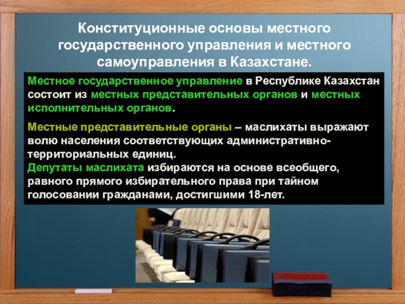 Слайд 23Конституционные основы местного государственного управления и местного самоуправления в Казахстане.