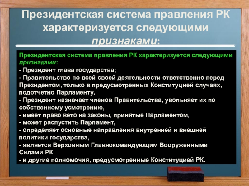 Слайд 16Президентская система правления РК характеризуется следующими признаками: