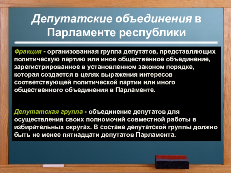 Депутатская группа - объединение депутатов для осуществления своих полномочий совместной работы в избирательных округах. В составе депутатской группы должно быть не менее пятнадцати депутатов Парламента.