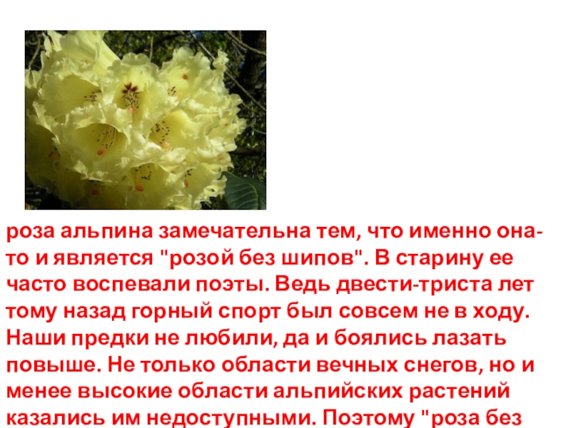 "розой без шипов". В старину ее часто воспевали поэты. Ведь двести-триста лет тому назад горный спорт был совсем не в ходу. Наши предки не любили, да и боялись лазать повыше. Не только области вечных снегов, но и менее высокие области альпийских растений казались им недоступными. Поэтому "роза без шипов" была символом труднодостижимого идеала.