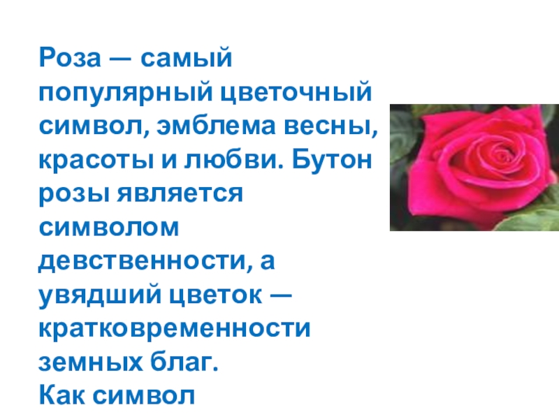 Слайд 3Роза — самый популярный цветочный символ, эмблема весны, красоты и любви.