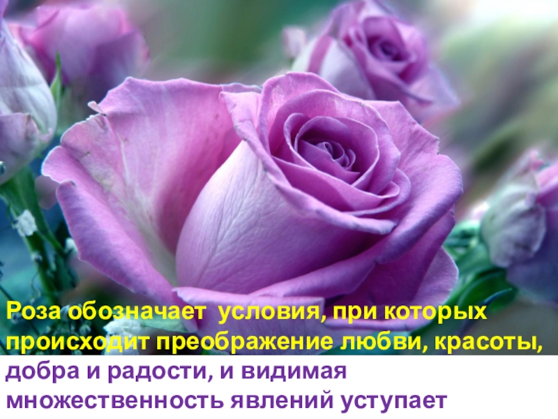Слайд 18Роза обозначает условия, при которых происходит преображение любви, красоты, добра и