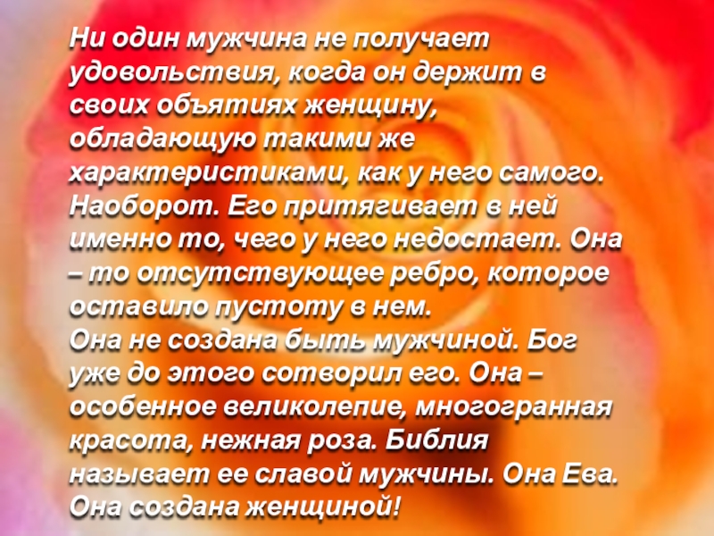 Она не создана быть мужчиной. Бог уже до этого сотворил его. Она – особенное великолепие, многогранная красота, нежная роза. Библия называет ее славой мужчины. Она Ева. Она создана женщиной!