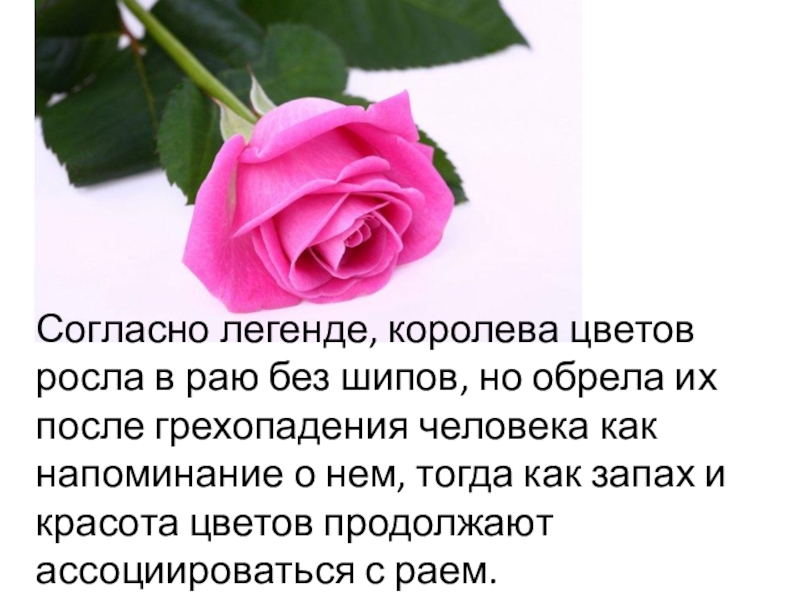 Слайд 10Согласно легенде, королева цветов росла в раю без шипов, но обрела