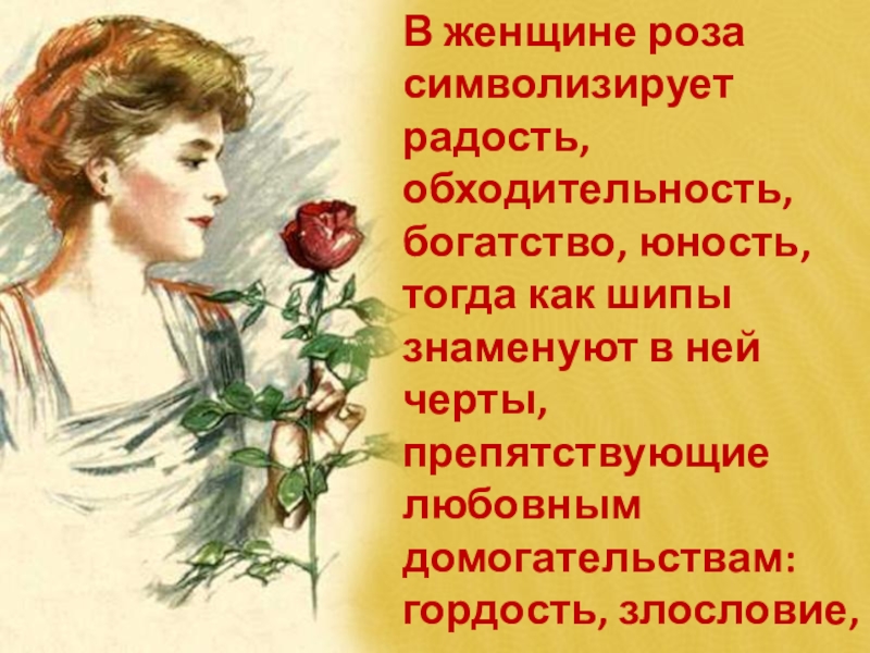 Слайд 4В женщине роза символизирует радость, обходительность, богатство, юность, тогда как шипы
