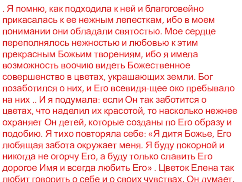 ее нежным лепесткам, ибо в моем понимании они обладали святостью. Мое сердце переполнялось нежностью и любовью к этим прекрасным Божьим творениям, ибо я имела возможность воочию видеть Божественное совершенство в цветах, украшающих земли. Бог позаботился о них, и Его всевидя-щее око пребывало на них .. И я подумала: если Он так заботится о цветах, что наделил их красотой, то насколько нежнее охраняет Он детей, которые созданы по Его образу и подобию. Я тихо повторяла себе: «Я дитя Божье, Его любящая забота окружает меня. Я буду покорной и никогда не огорчу Его, а буду только славить Его дорогое Имя и всегда любить Его» . Цветок Елена так любит говорить о себе и о своих чувствах. Он думает, что растет к солнцу, словно забывая, что корни его в земле..