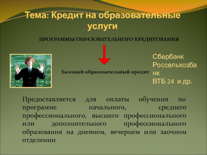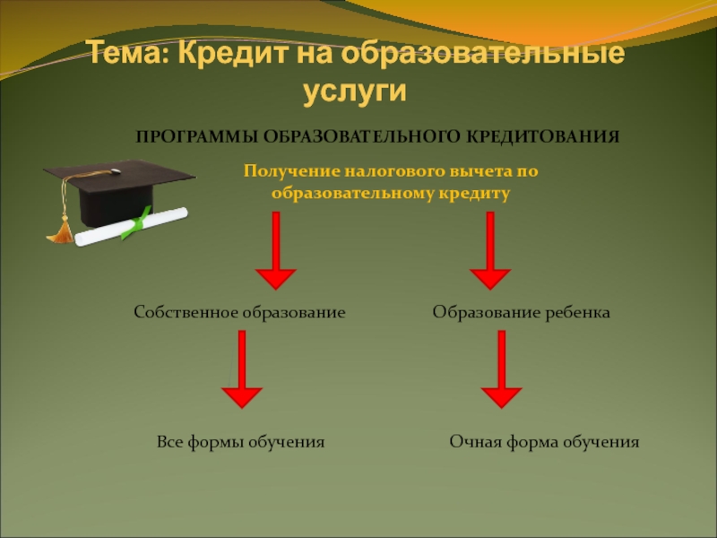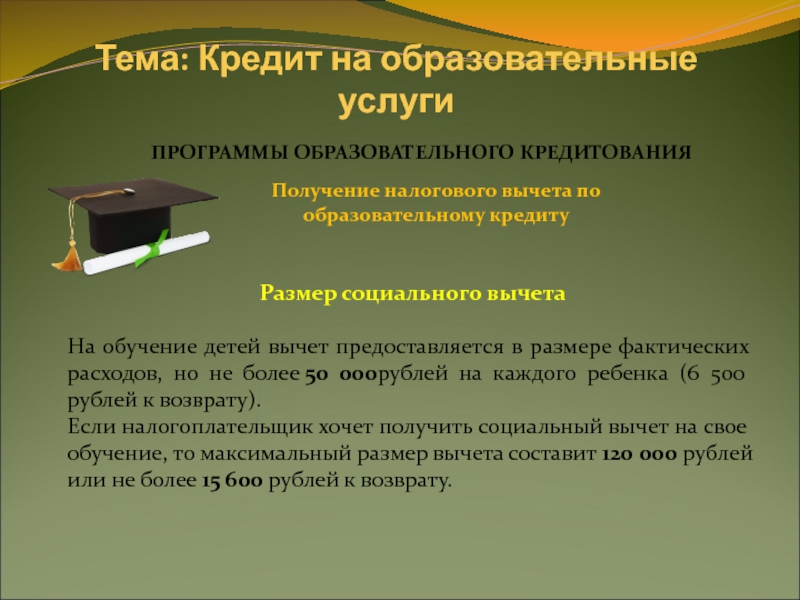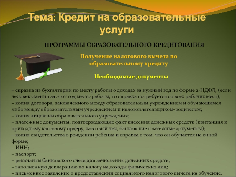 Предоставляется для оплаты обучения по программе начального, среднего профессионального, высшего профессионального или дополнительного профессионального образования на дневном, вечернем или заочном отделении