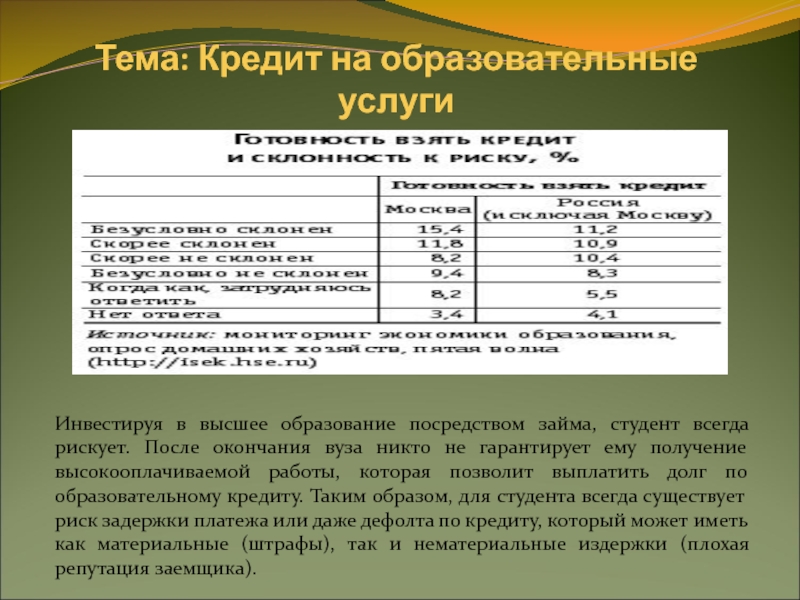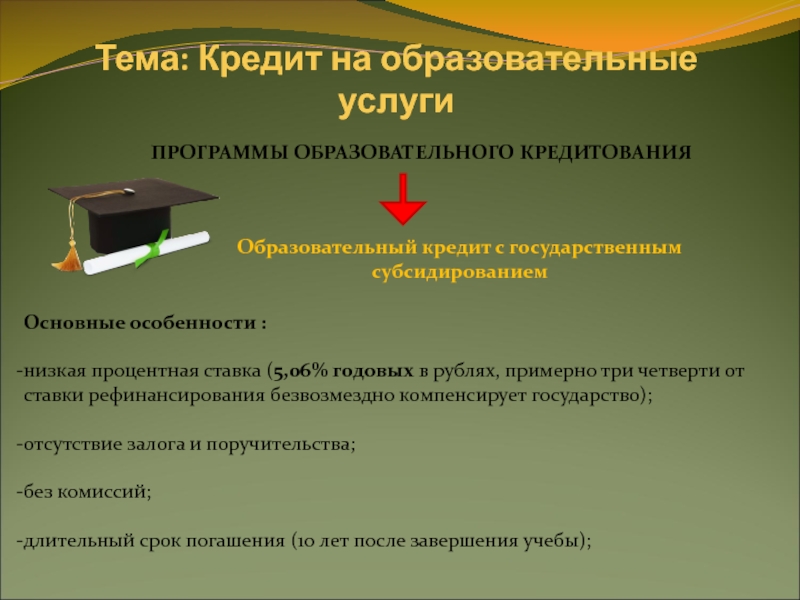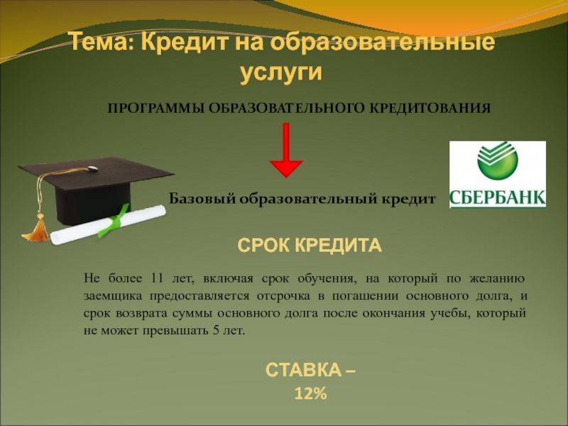 Не более 11 лет, включая срок обучения, на который по желанию заемщика предоставляется отсрочка в погашении основного долга, и срок возврата суммы основного долга после окончания учебы, который не может превышать 5 лет.