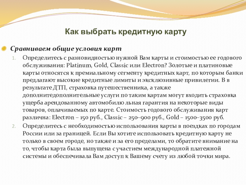карты и стоимостью ее годового обслуживания: Рlatinum, Gold, Classic или Electron? Золотые и платиновые карты относятся к премиальному сегменту кредитных карт, по которым банки предлагают высокие кредитные лимиты и эксклюзивные привилегии. В в результате ДТП, страховка путешественника, а также дополнитедополнительные услуги по таким картам могут входить страховка ущерба арендованному автомобилю льная гарантия на некоторые виды товаров, оплачиваемых по карте. Стоимость годового обслуживания карт различна: Electron – 150 руб., Classic – 250–900 руб., Gold – 1500–3500 руб.