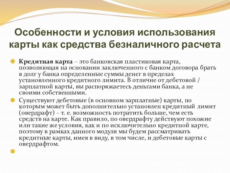 Слайд 6Особенности и условия использования карты как средства безналичного расчета