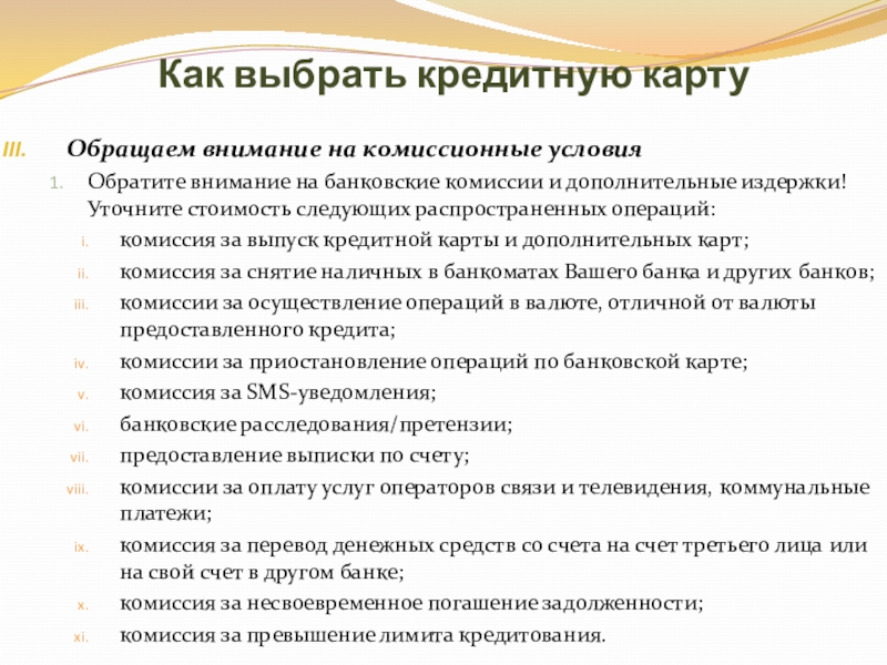 процентов и комиссий по кредиту. Помните, что «бесплатных» кредитов не бывает, это лишь рекламные уловки.
