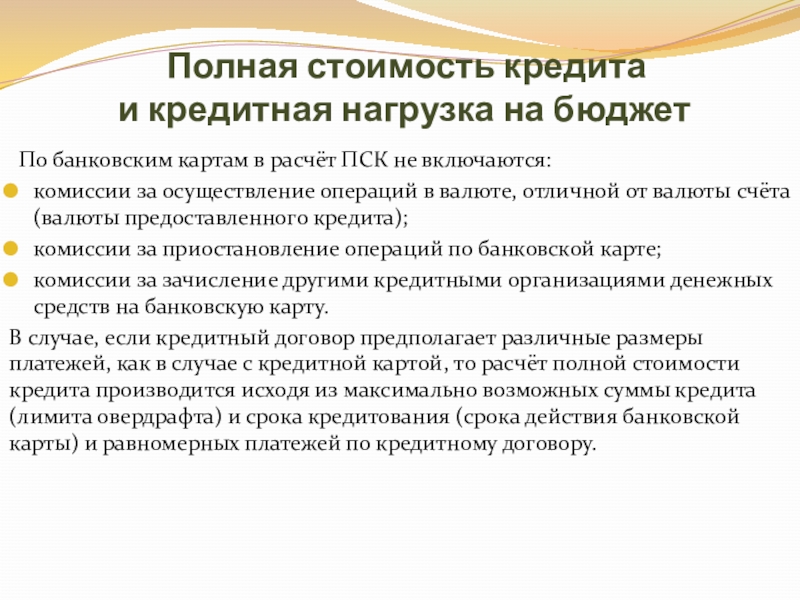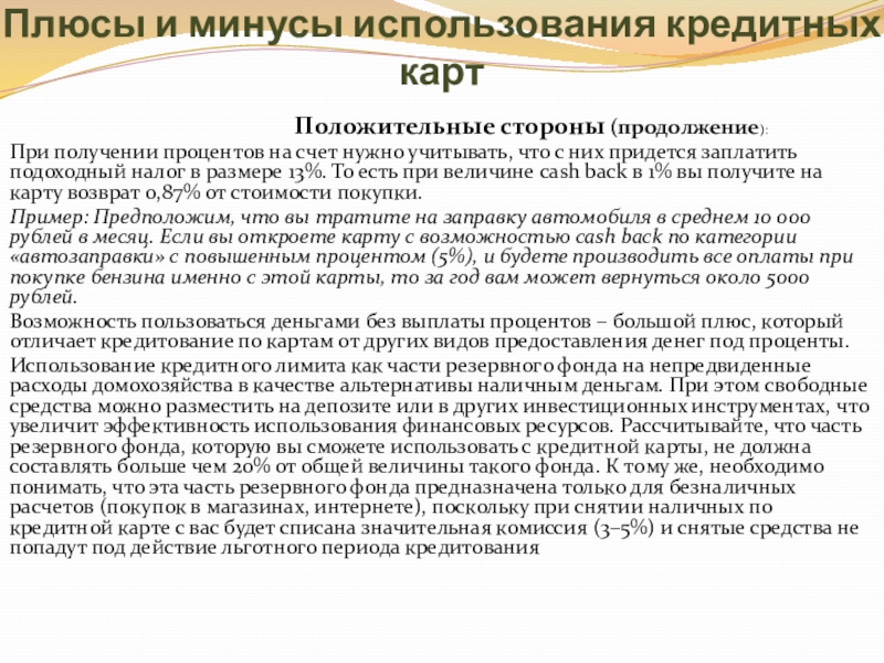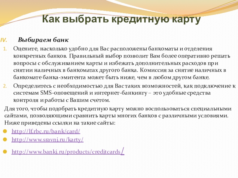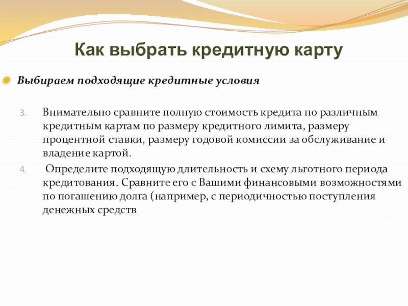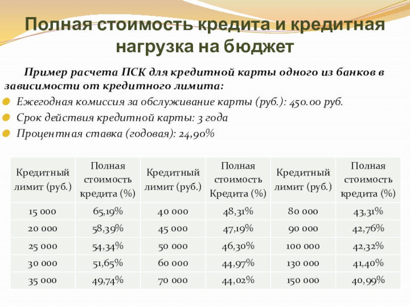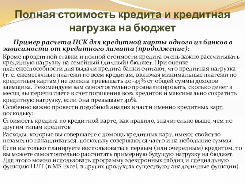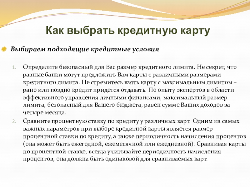 кредитного лимита. Не секрет, что разные банки могут предложить Вам карты с различными размерами кредитного лимита. Не стремитесь взять карту с максимальным лимитом – рано или поздно кредит придется отдавать. По опыту экспертов в области эффективного управления личными финансами, максимальный размер лимита, безопасный для Вашего бюджета, равен сумме Ваших доходов за четыре месяца.