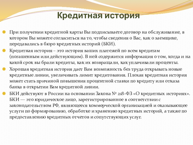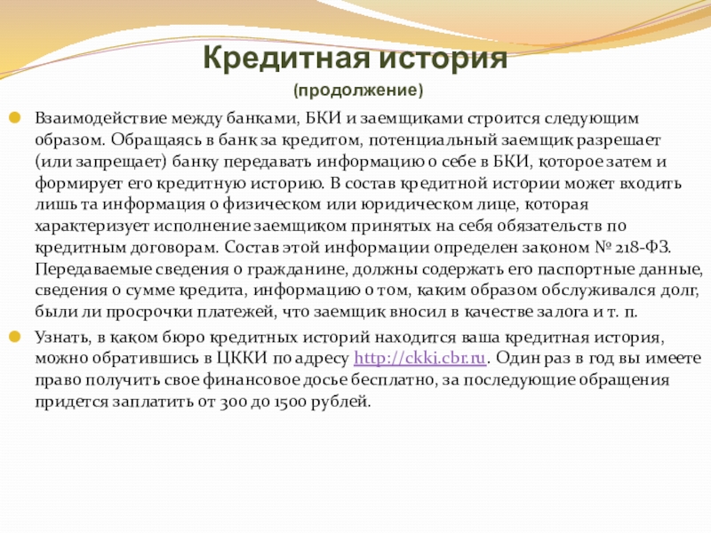 образом. Обращаясь в банк за кредитом, потенциальный заемщик разрешает (или запрещает) банку передавать информацию о себе в БКИ, которое затем и формирует его кредитную историю. В состав кредитной истории может входить лишь та информация о физическом или юридическом лице, которая характеризует исполнение заемщиком принятых на себя обязательств по кредитным договорам. Состав этой информации определен законом № 218-ФЗ. Передаваемые сведения о гражданине, должны содержать его паспортные данные, сведения о сумме кредита, информацию о том, каким образом обслуживался долг, были ли просрочки платежей, что заемщик вносил в качестве залога и т. п.