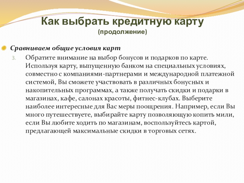на выбор бонусов и подарков по карте. Используя карту, выпущенную банком на специальных условиях, совместно с компаниями-партнерами и международной платежной системой, Вы сможете участвовать в различных бонусных и накопительных программах, а также получать скидки и подарки в магазинах, кафе, салонах красоты, фитнес-клубах. Выберите наиболее интересные для Вас меры поощрения. Например, если Вы много путешествуете, выбирайте карту позволяющую копить мили, если Вы любите ходить по магазинам, воспользуйтесь картой, предлагающей максимальные скидки в торговых сетях.