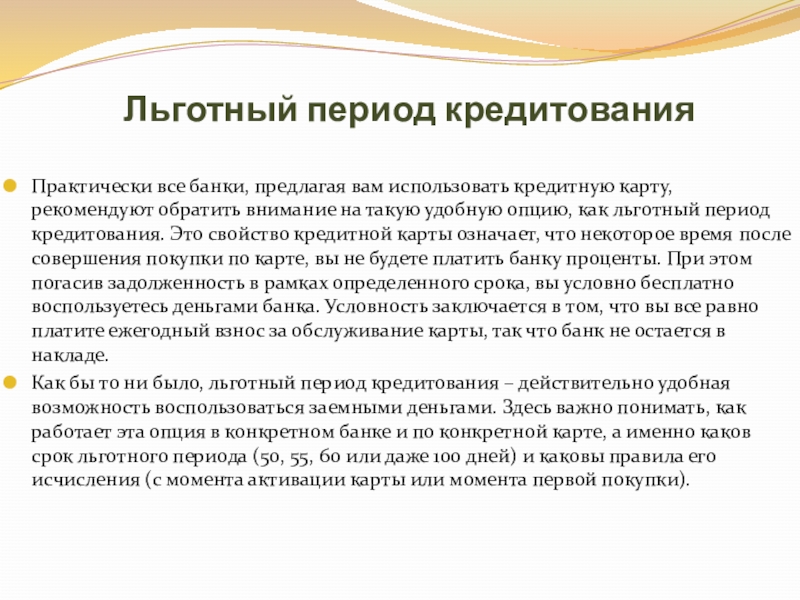 обратить внимание на такую удобную опцию, как льготный период кредитования. Это свойство кредитной карты означает, что некоторое время после совершения покупки по карте, вы не будете платить банку проценты. При этом погасив задолженность в рамках определенного срока, вы условно бесплатно воспользуетесь деньгами банка. Условность заключается в том, что вы все равно платите ежегодный взнос за обслуживание карты, так что банк не остается в накладе.