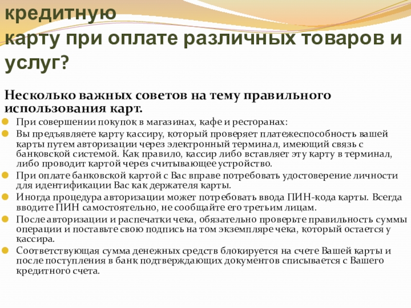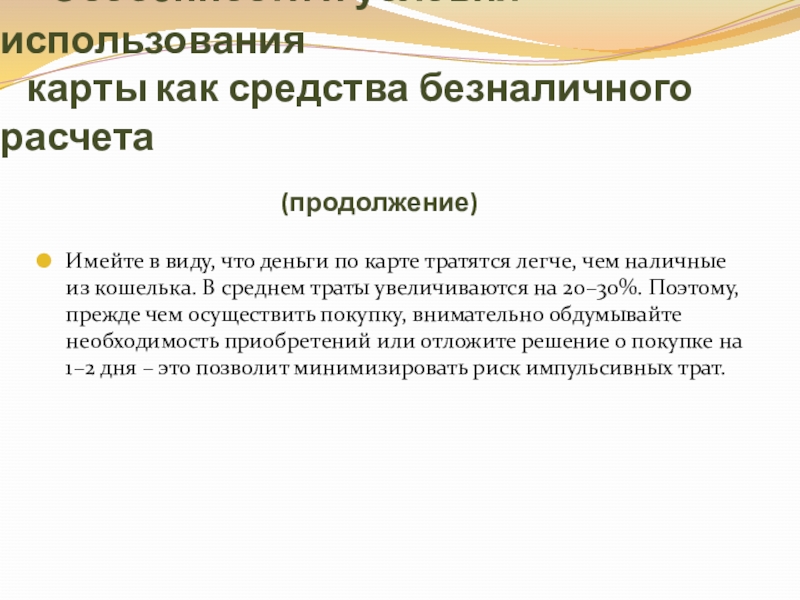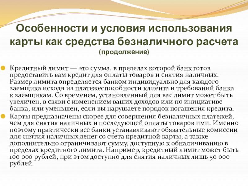 Слайд 7Особенности и условия использования карты как средства безналичного расчета