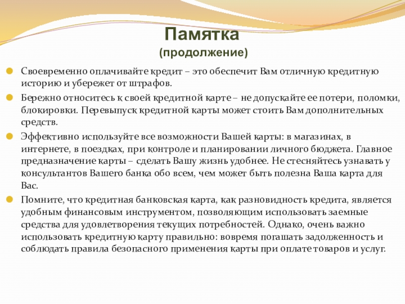Помните, что кредитная банковская карта, как разновидность кредита, является удобным финансовым инструментом, позволяющим использовать заемные средства для удовлетворения текущих потребностей. Однако, очень важно использовать кредитную карту правильно: вовремя погашать задолженность и соблюдать правила безопасного применения карты при оплате товаров и услуг.