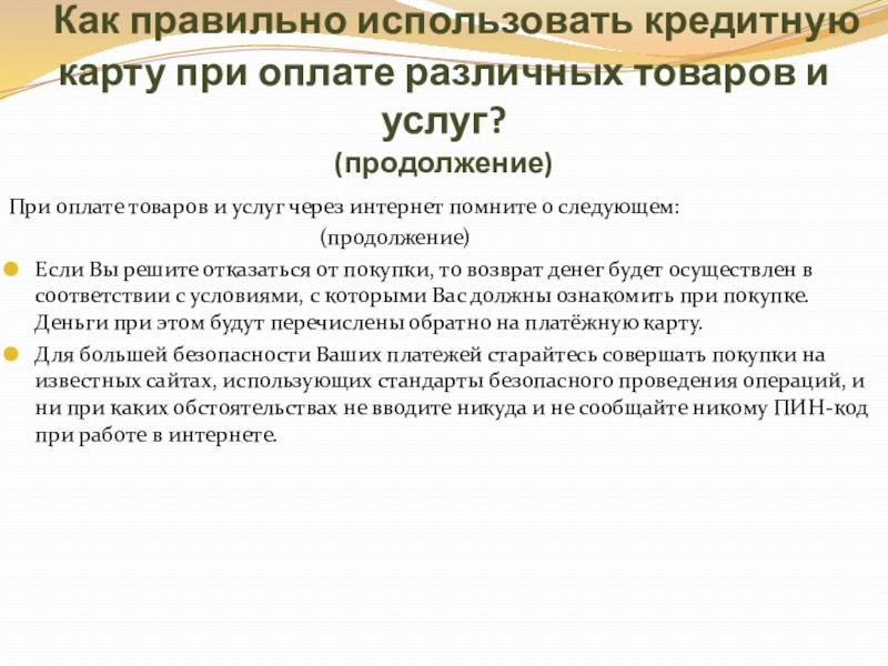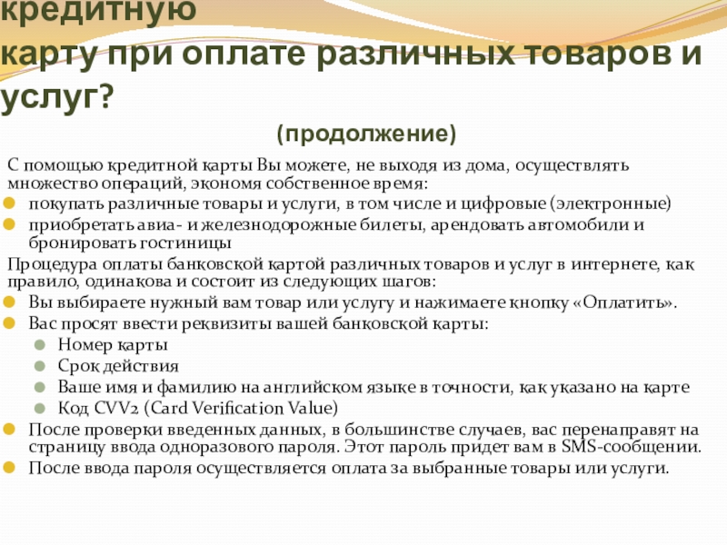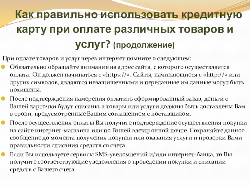 кредитная банковская карта, как разновидность кредита, является удобным финансовым инструментом, позволяющим использовать заемные средства для удовлетворения текущих потребностей. Однако очень важно использовать кредитную карту правильно: вовремя погашать задолженность и соблюдать правила безопасного применения карты при оплате товаров и услуг.
