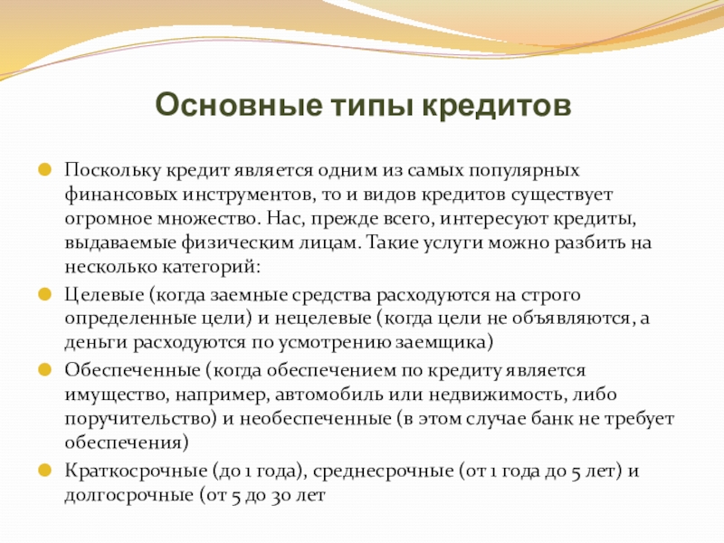 самых популярных финансовых инструментов, то и видов кредитов существует огромное множество. Нас, прежде всего, интересуют кредиты, выдаваемые физическим лицам. Такие услуги можно разбить на несколько категорий: