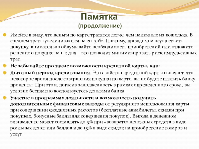 наличные из кошелька. В среднем траты увеличиваются на 20–30%. Поэтому, прежде чем осуществить покупку, внимательно обдумывайте необходимость приобретений или отложите решение о покупке на 1–2 дня – это позволит минимизировать риск импульсивных трат.