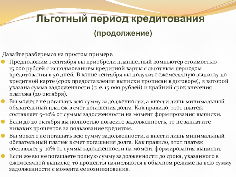 Предположим 1 сентября вы приобрели планшетный компьютер стоимостью 15 000 рублей с использованием кредитной карты с льготным периодом кредитования в 50 дней. В конце сентября вы получите ежемесячную выписку по кредитной карте (срок предоставления выписки прописан в договоре), в которой указана сумма задолженности (т. е. 15 000 рублей) и крайний срок внесения платежа (20 октября).