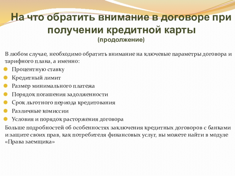 Больше подробностей об особенностях заключения кредитных договоров с банками и защите своих прав, как потребителя финансовых услуг, вы можете найти в модуле «Права заемщика»