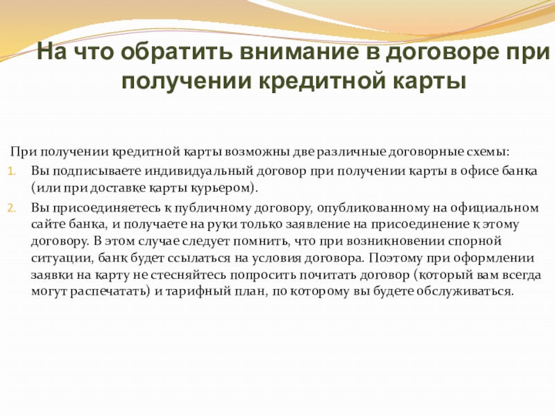 Вы присоединяетесь к публичному договору, опубликованному на официальном сайте банка, и получаете на руки только заявление на присоединение к этому договору. В этом случае следует помнить, что при возникновении спорной ситуации, банк будет ссылаться на условия договора. Поэтому при оформлении заявки на карту не стесняйтесь попросить почитать договор (который вам всегда могут распечатать) и тарифный план, по которому вы будете обслуживаться.