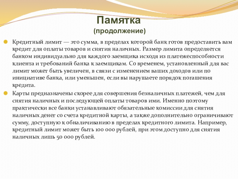 предоставить вам кредит для оплаты товаров и снятия наличных. Размер лимита определяется банком индивидуально для каждого заемщика исходя из платежеспособности клиента и требований банка к заемщикам. Со временем, установленный для вас лимит может быть увеличен, в связи с изменением ваших доходов или по инициативе банка, или уменьшен, если вы нарушаете порядок погашения кредита.