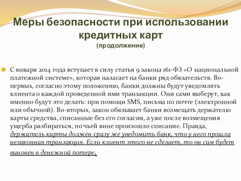 статья 9 закона 161-ФЗ «О национальной платежной системе», которая налагает на банки ряд обязательств. Во-первых, согласно этому положению, банки должны будут уведомлять клиента о каждой проведенной ими транзакции. Они сами выберут, как именно будут это делать: при помощи SMS, письма по почте (электронной или обычной). Во-вторых, закон обязывает банки возмещать держателю карты средства, списанные без его согласия, а уже после возмещения ущерба разбираться, по чьей вине произошло списание. Правда, держатель карты должен сразу же уведомить банк, что у него прошла незаконная транзакция. Если клиент этого не сделает, то он сам будет виновен в денежной потере.