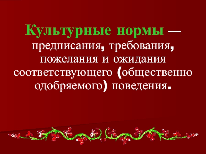 Культурные нормы — предписания, требования, пожелания и ожидания соответствующего (общественно одобряемого) поведения.