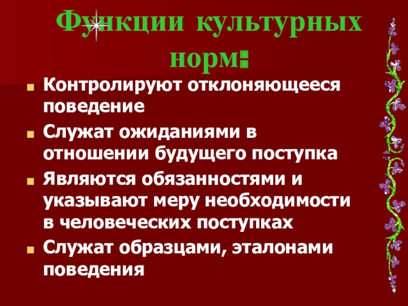 Функции культурных норм:Контролируют отклоняющееся поведениеСлужат ожиданиями в отношении будущего поступкаЯвляются обязанностями и указывают меру необходимости в человеческих