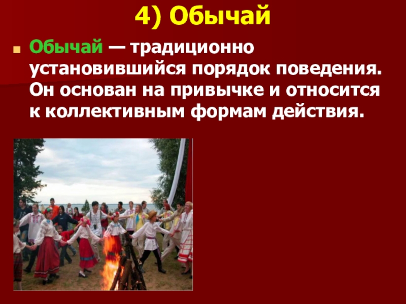 4) ОбычайОбычай — традиционно установившийся порядок поведения. Он основан на привычке и относится к коллективным формам действия.