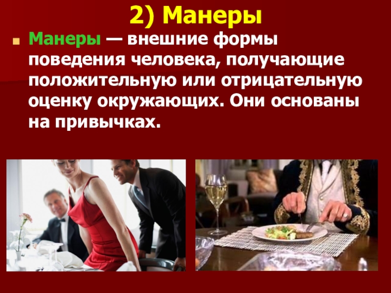 2) МанерыМанеры — внешние формы поведения человека, получающие положительную или отрицательную оценку окружающих. Они основаны на привычках.