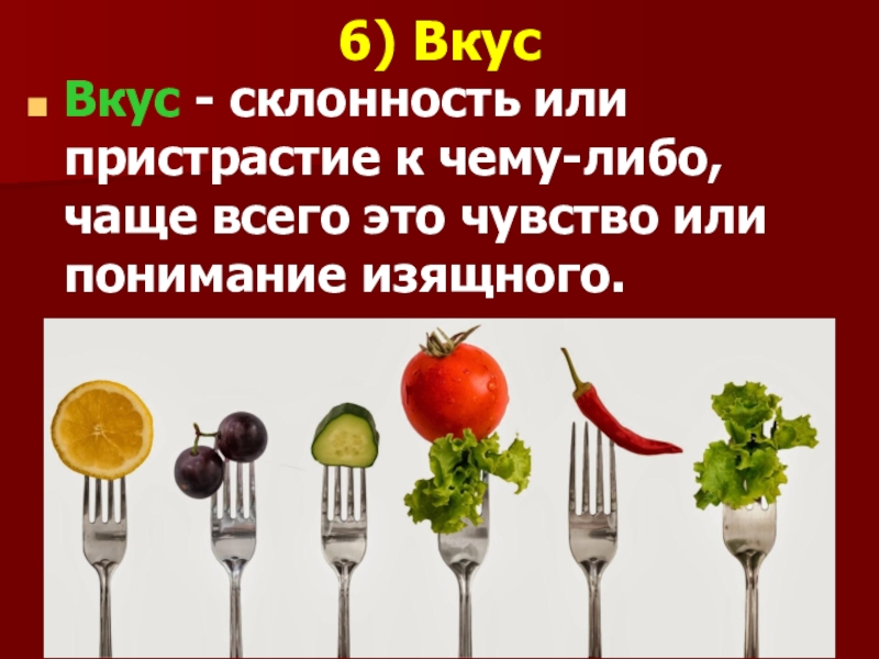6) ВкусВкус - склонность или пристрастие к чему-либо, чаще всего это чувство или понимание изящного.