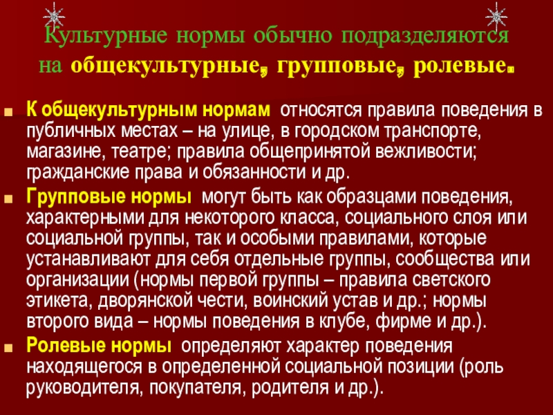 Культурные нормы обычно подразделяются на общекультурные, групповые, ролевые.К общекультурным нормам относятся правила поведения в публичных местах – на улице,
