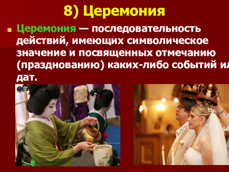 8) ЦеремонияЦеремония — последовательность действий, имеющих символическое значение и посвященных отмечанию (празднованию) каких-либо событий или дат.