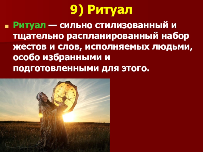 9) РитуалРитуал — сильно стилизованный и тщательно распланированный набор жестов и слов, исполняемых людьми, особо избранными и