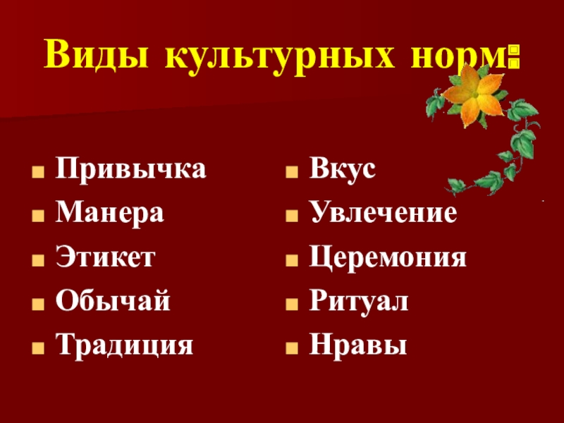 Виды культурных норм:ПривычкаМанераЭтикетОбычайТрадицияВкусУвлечениеЦеремонияРитуалНравы