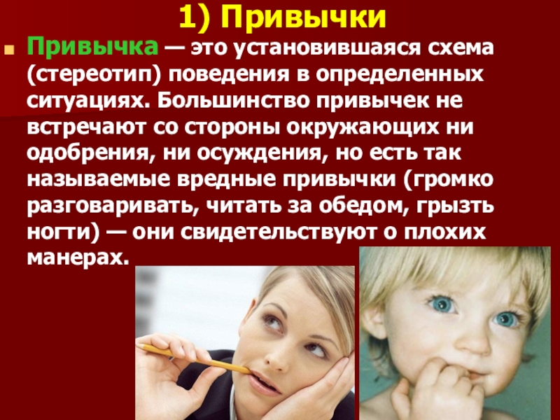 Большинство привычек не встречают со стороны окружающих ни одобрения, ни осуждения, но есть так называемые вредные привычки (громко разговаривать, читать за обедом, грызть ногти) — они свидетельствуют о плохих манерах.