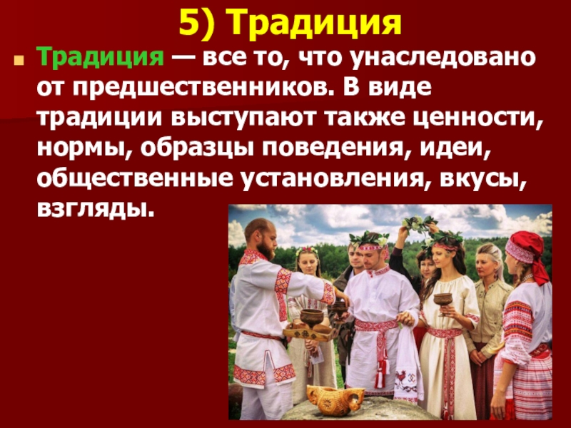 5) ТрадицияТрадиция — все то, что унаследовано от предшественников. В виде традиции выступают также ценности, нормы, образцы