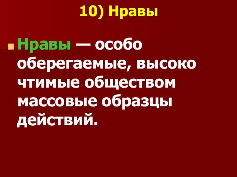 10) НравыНравы — особо оберегаемые, высоко чтимые обществом массовые образцы действий.