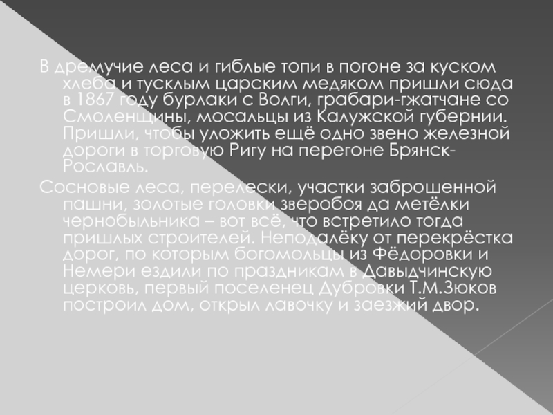 Сосновые леса, перелески, участки заброшенной пашни, золотые головки зверобоя да метёлки чернобыльника – вот всё, что встретило тогда пришлых строителей. Неподалёку от перекрёстка дорог, по которым богомольцы из Фёдоровки и Немери ездили по праздникам в Давыдчинскую церковь, первый поселенец Дубровки Т.М.Зюков построил дом, открыл лавочку и заезжий двор.